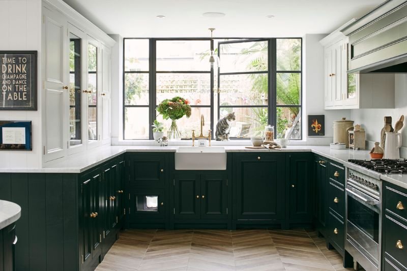 We design smart corner cabinets with pull-out trays to make sure no space is wasted. This layout is perfect for open-plan homes, as it gives you plenty of floor space and makes your kitchen feel large and airy.